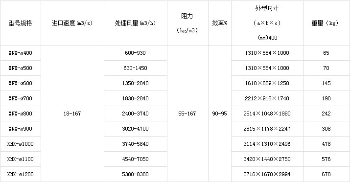 XNX型旋风除尘器为牛角弯体椎斜底型除尘器,入口含尘浓度应低于50克/m3,入口速度不小于18米/秒,粉尘微粒不大于1毫米,适用于一般工业通风除尘系统,工业尾气中处重物料回收,如冶金、电力、机械加工、石油化工、建材等部门,再加适当内称后,可用于磨损较大或有腐蚀性的场合,但不能用粘性粉尘。